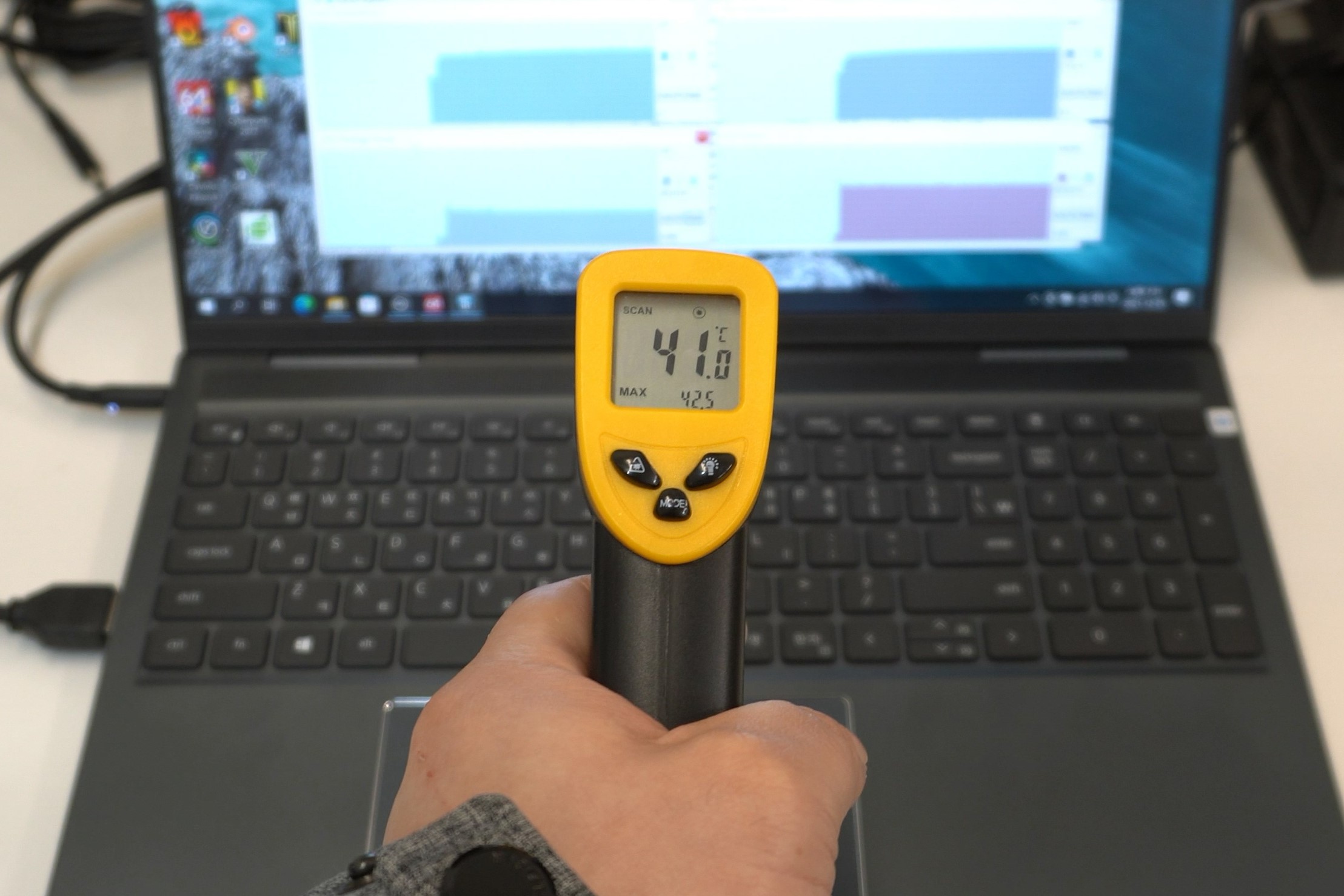 내부 온도 자체는 낮게 유지가 되기 때문에 표면으로 전달되는 온도 역시 낮은 편입니다. 키보드 중앙 상단은 41도 정도까지 올라가긴 하는데, 사용자의 손이 닿는 부위는 아니라 신경 쓰이지 않고, 그 외에는 WASD 키 주변도 38도 내외로 쾌적한 편이었어요.