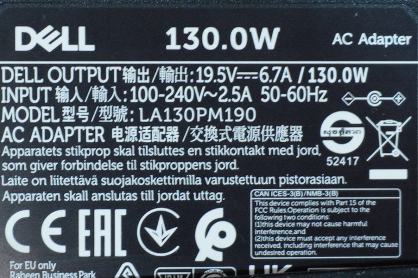 기본 충전기도 130W 규격이라서 상당히 가볍습니다. (약 500g) 대부분의 게이밍 노트북 충전기와 비교하면 반토막 수준이라고 봐야겠죠. 그런데 충전기 모양이 심하게 못생겼어요. 사실 큰 단점이라고 하기는 어렵지만, 대부분의 델 노트북은 충전기가 이쁜 실린더 모양이어서 유난히 아쉽더라고요. 그래서 저희는 어차피 충전기를 2개 구비하고 사용하는 편이라서 XPS에 사용되는 실린더형 130W 충전기를 따로 구매했습니다. 문제없이 호환이 되더라고요.