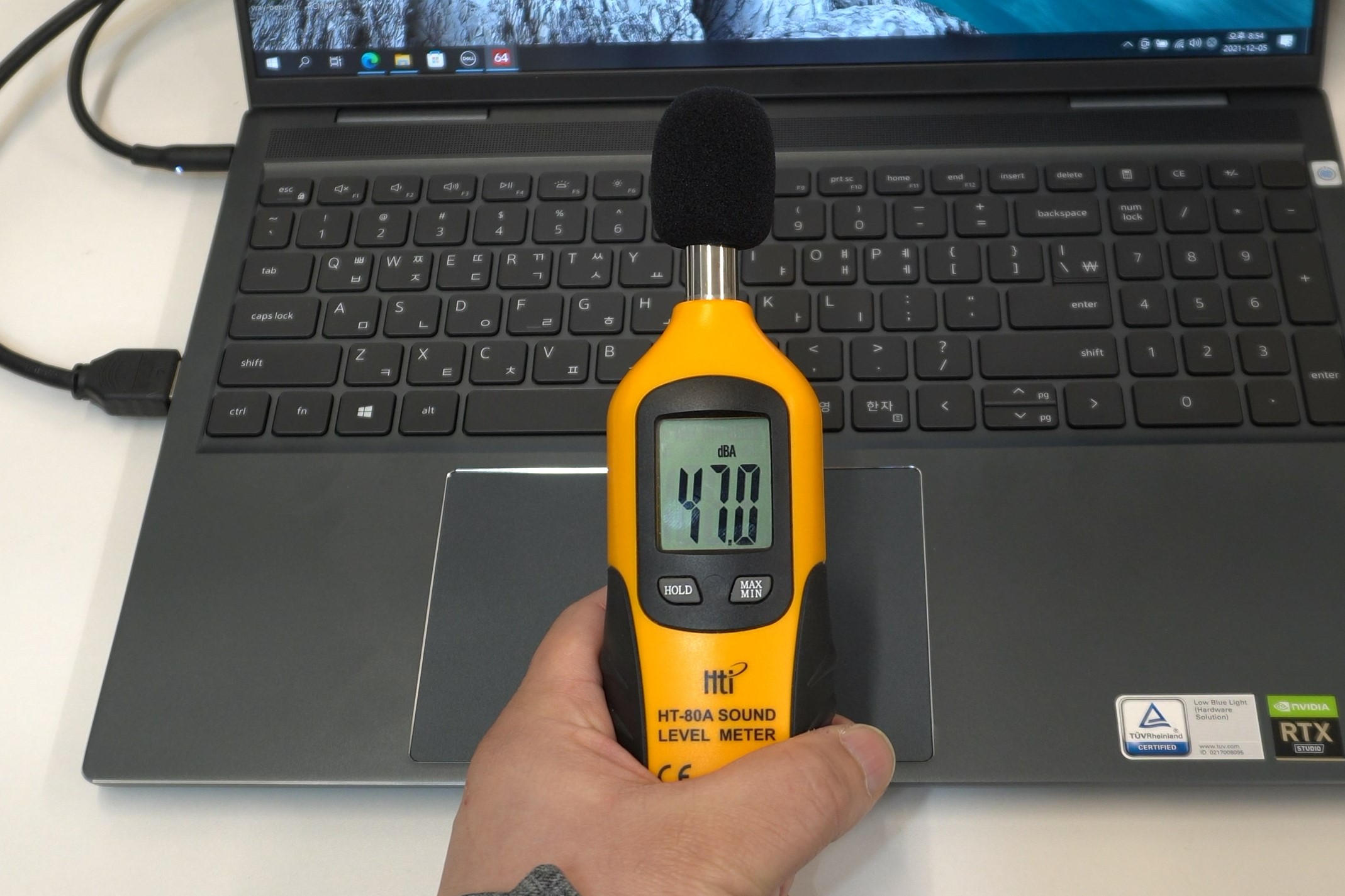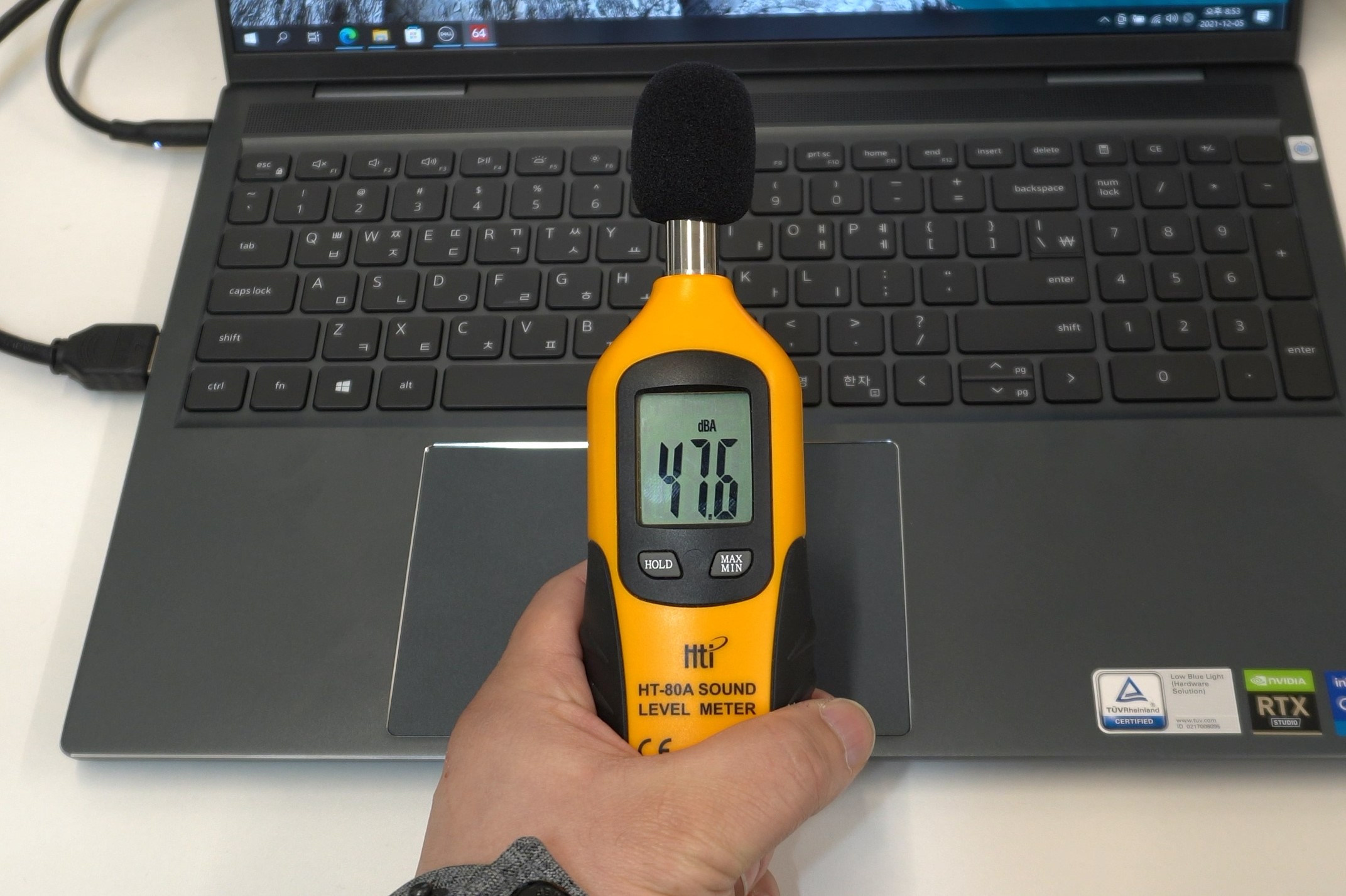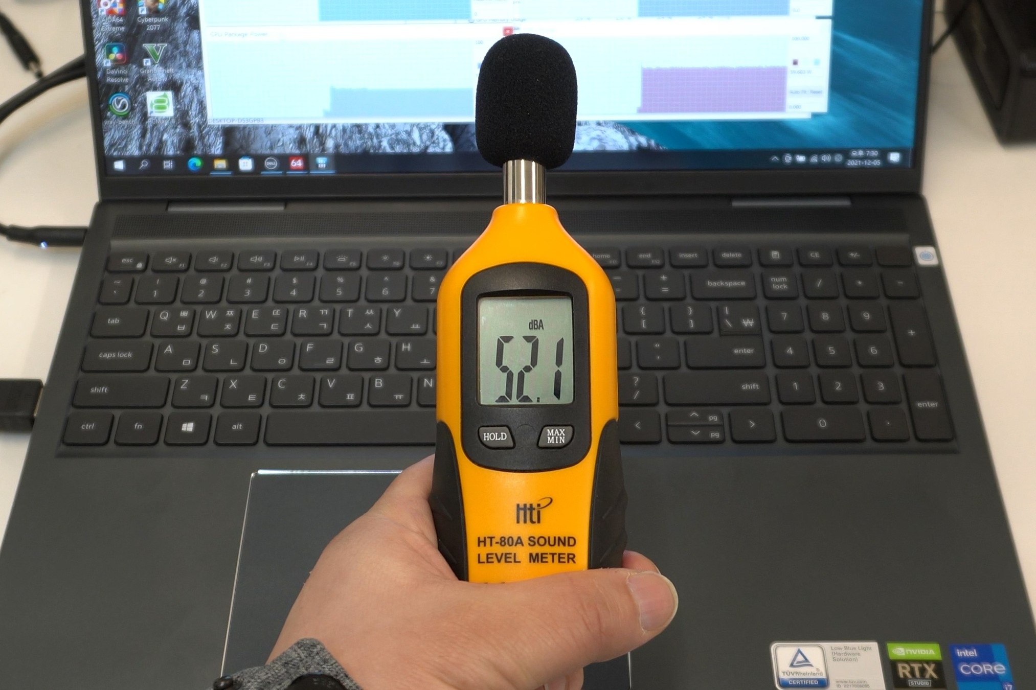 앞서 언급했던 여러 쿨링 설계의 문제들 때문에 예상보다 팬 소음이 시끄러운 편입니다. 4면 배기, 혹은 드롭 힌지 설계 정도만 적용해줬어도 훨씬 좋은 모습을 보여줬을 것 같은데 개인적으로 매우 아쉽네요. 그래도 최대 성능 모드 기준 대부분의 게이밍 노트북은 55dB까지 올라가는 경우가 많으니까 인스피론16 7610도 크리에이터 노트북 중에서 시끄럽다 뿐이지, 게이밍 노트북과 비교하면 그래도 정숙한 편이라고 볼 수 있습니다.