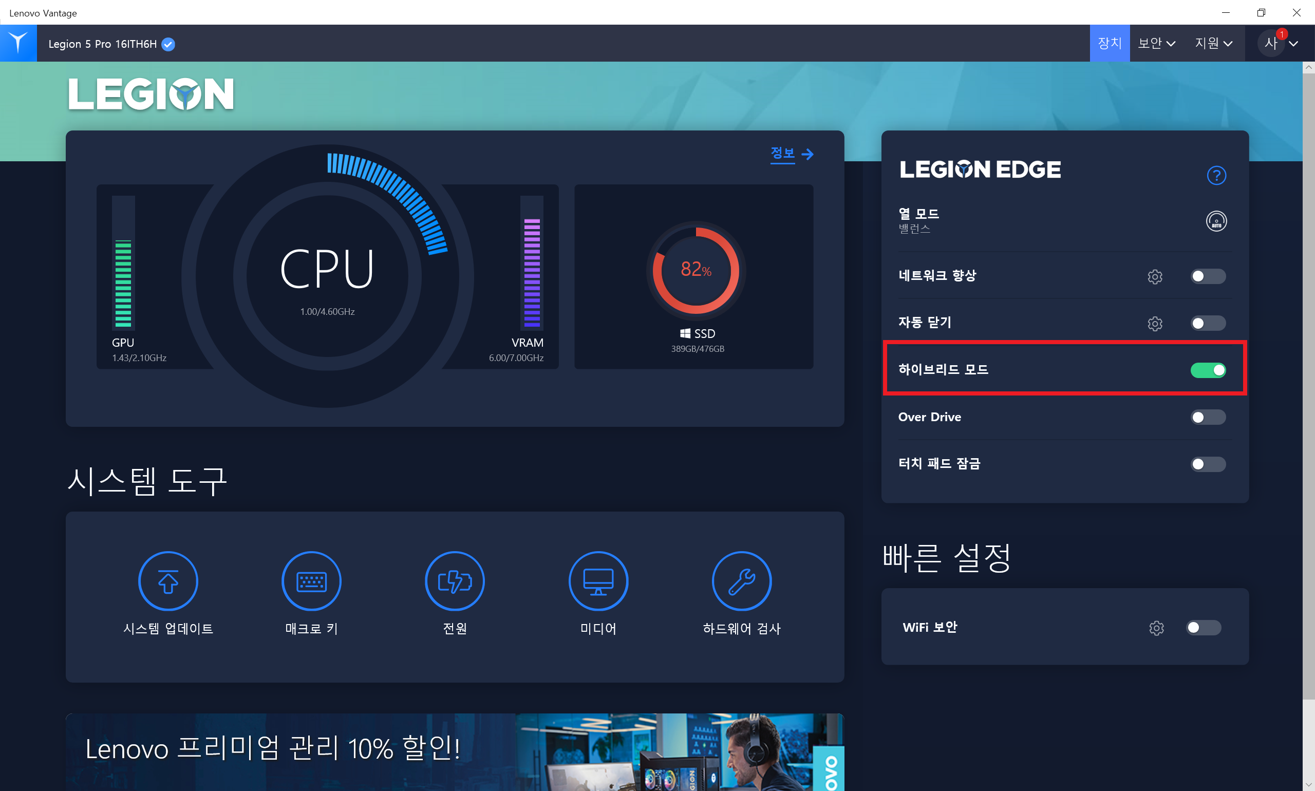 Lenovo Vantage라는 시스템 컨트롤 소프트웨어는 항상 기능이 좋다는 평가를 받아왔습니다. 시스템 드라이버도 자동으로 감지해서 업데이트할 수 있고, 배터리 충전 제한, 성능모드 변경, 매그로 단축키 지정 등 일반적인 사용자가 기대하는 기능은 모두 충실하게 탑재되어 있습니다.