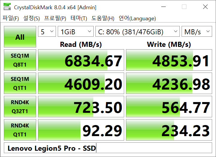 리전5 프로 라이젠 모델은 SSD 슬롯이 PCIe 3.0 방식이었는데, 인텔 모델은 PCIe 4.0 방식이라서 속도가 더 빠르게 측정됐습니다. (PCIe 3.0은 약 4000MB/s 정도가 한계) 솔직히 대부분의 사용자는 PCIe 3.0 속도도 모두 활용할 일이 없을 정도로 빠르긴 할 건데, 그래도 최신 규격이 지원된다는 점은 분명 기분 좋은 일이긴 하죠.