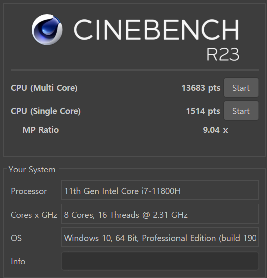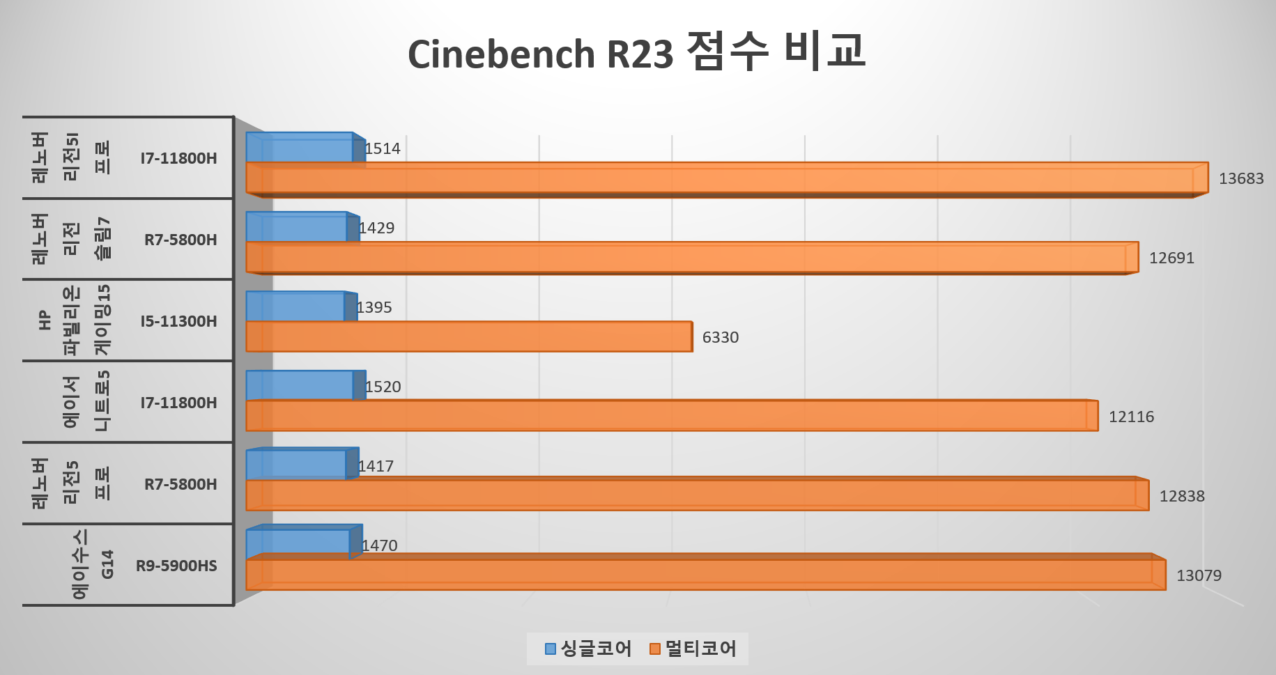그러니까 일정 전력 구간 이상부터는 인텔의 타이거레이크 CPU가 훨씬 좋은 성능을 보여주기 시작하는데, 제가 여러 노트북을 테스트하면서 대략 이 구간이 50~55W 정도라고 느껴졌습니다. 리전5i 프로는 CPU에 최대 85W까지 유지 가능한 모델이기 때문에 시네벤치 CPU 벤치마크에서도 싱글코어, 멀티코어 점수가 모두 앞서는 모습을 보여주고요.