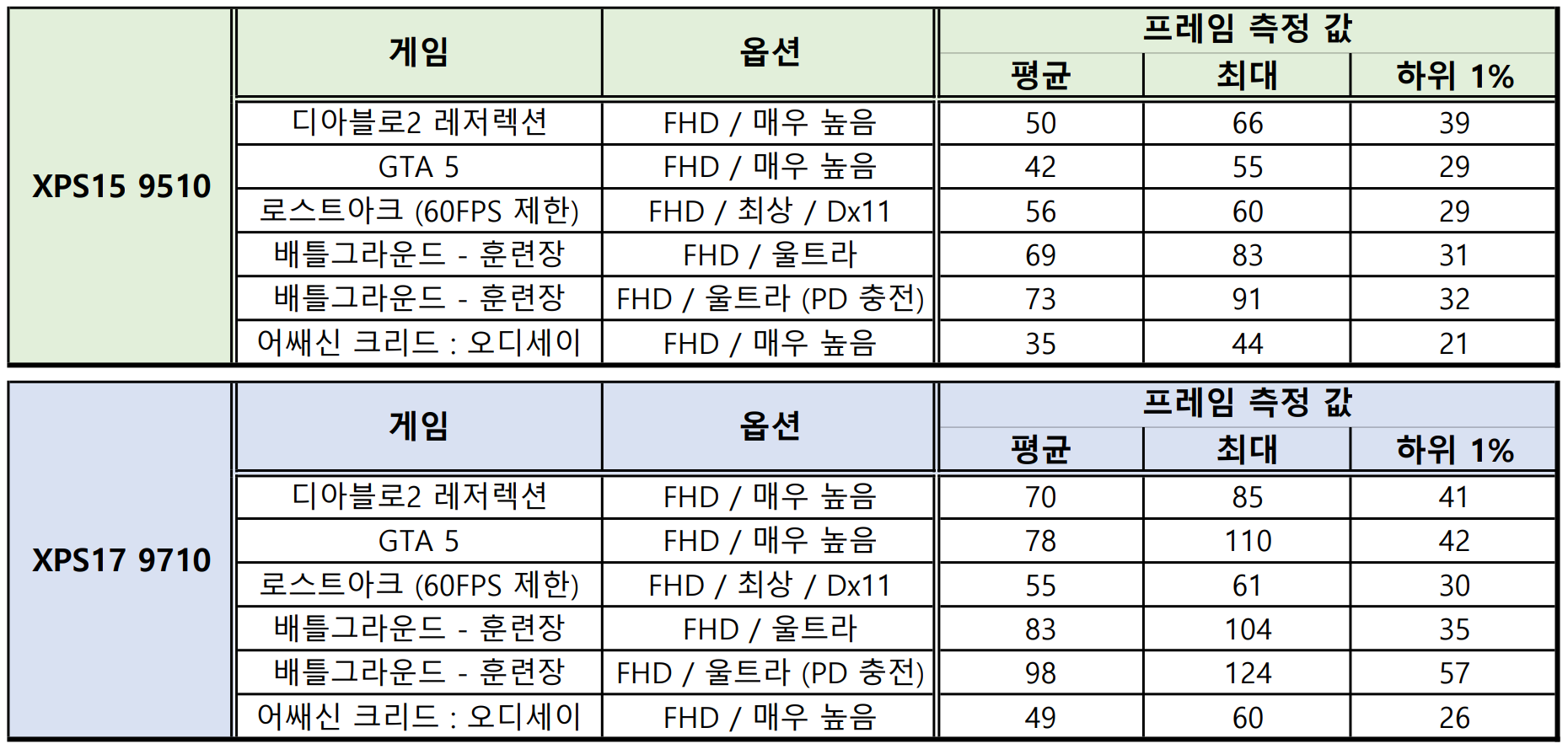 게임 성능은, 고사양 타이틀도 옵션 타협하면 60프레임 방어는 가능한 수준이라고 보시면 됩니다. 제가 사용한 XPS 17 모델은 4K 모델이라서 네이티브 해상도가 아니어서 약간 프레임 손해가 있었고, XPS 15는 FHD 모델이기 때문에 해상도로 인한 프레임 손해는 없는 대신 TGP가 워낙 낮아서 제가 기대한 것보다는 프레임이 조금 낮게 나왔네요.