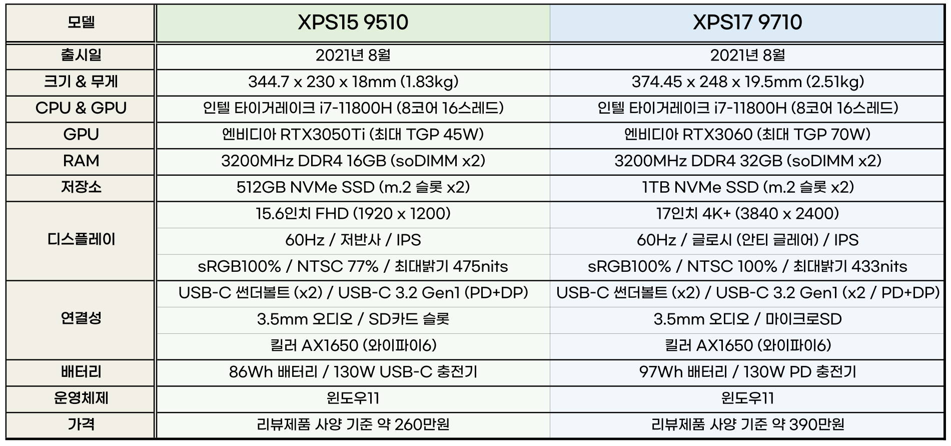 | 항목 | XPS 15 9510 | XPS 17 9710 | ||