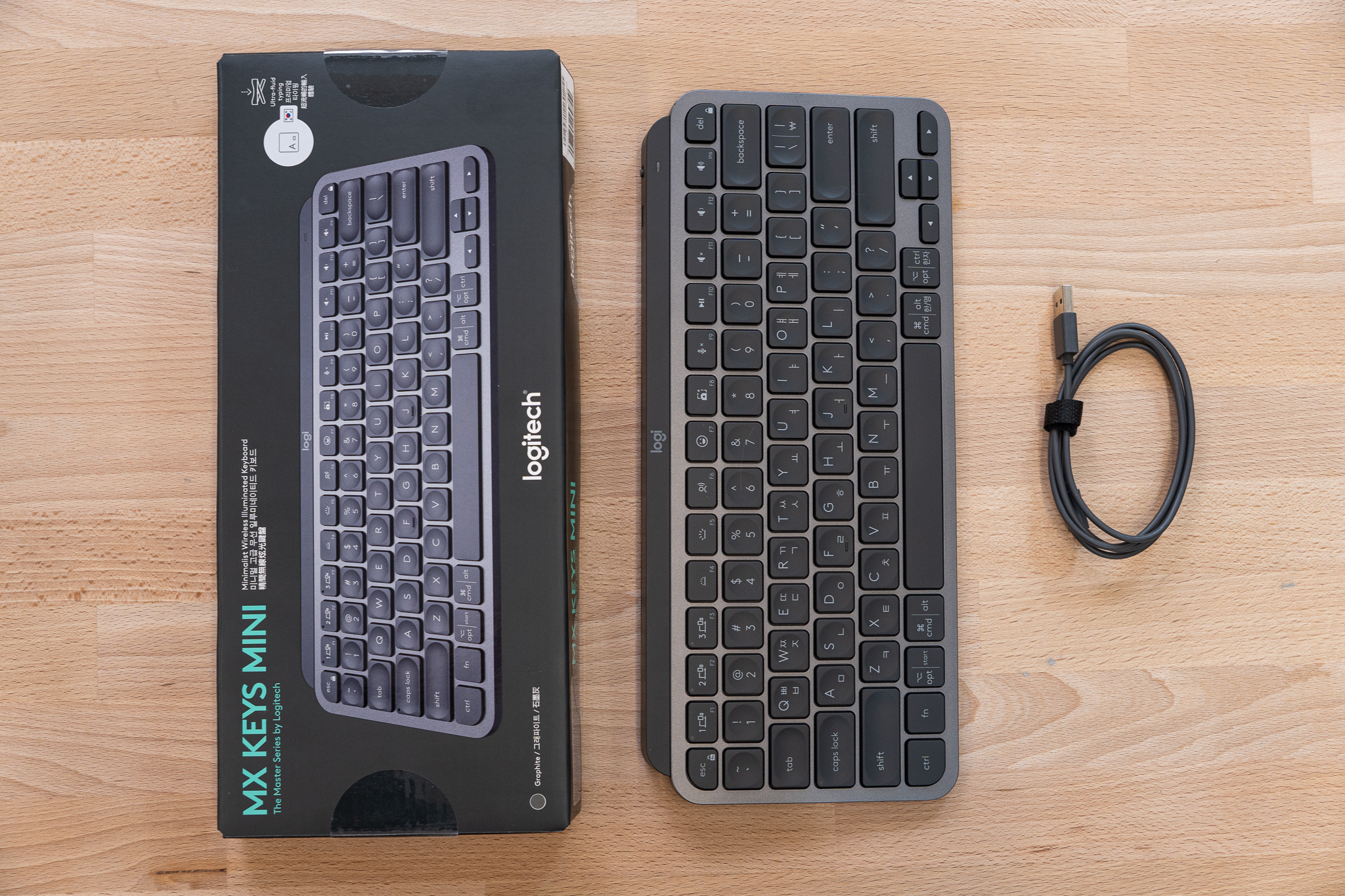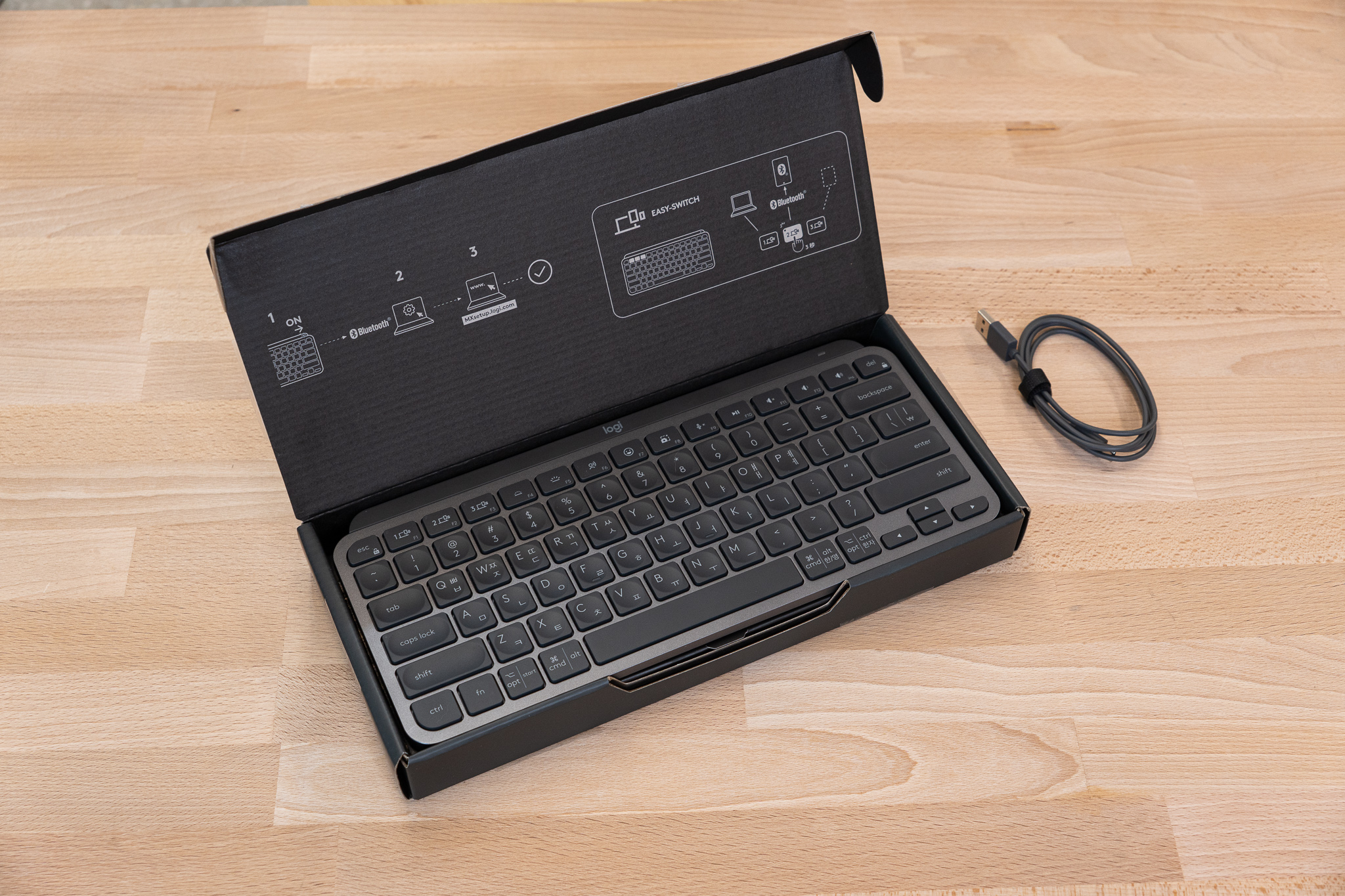 박스 구성품은 초라할 정도로 단출합니다. 키보드 본체와 충전용 USB 케이블(A to C)이 끝이에요. 아무리 그래도 로지텍의 MX 시리즈면 나름 프리미엄 라인업인데, 키보드 청소용 천이나 브러시 정도는 같이 넣어줄 수 있지 않았을까 싶은데요...