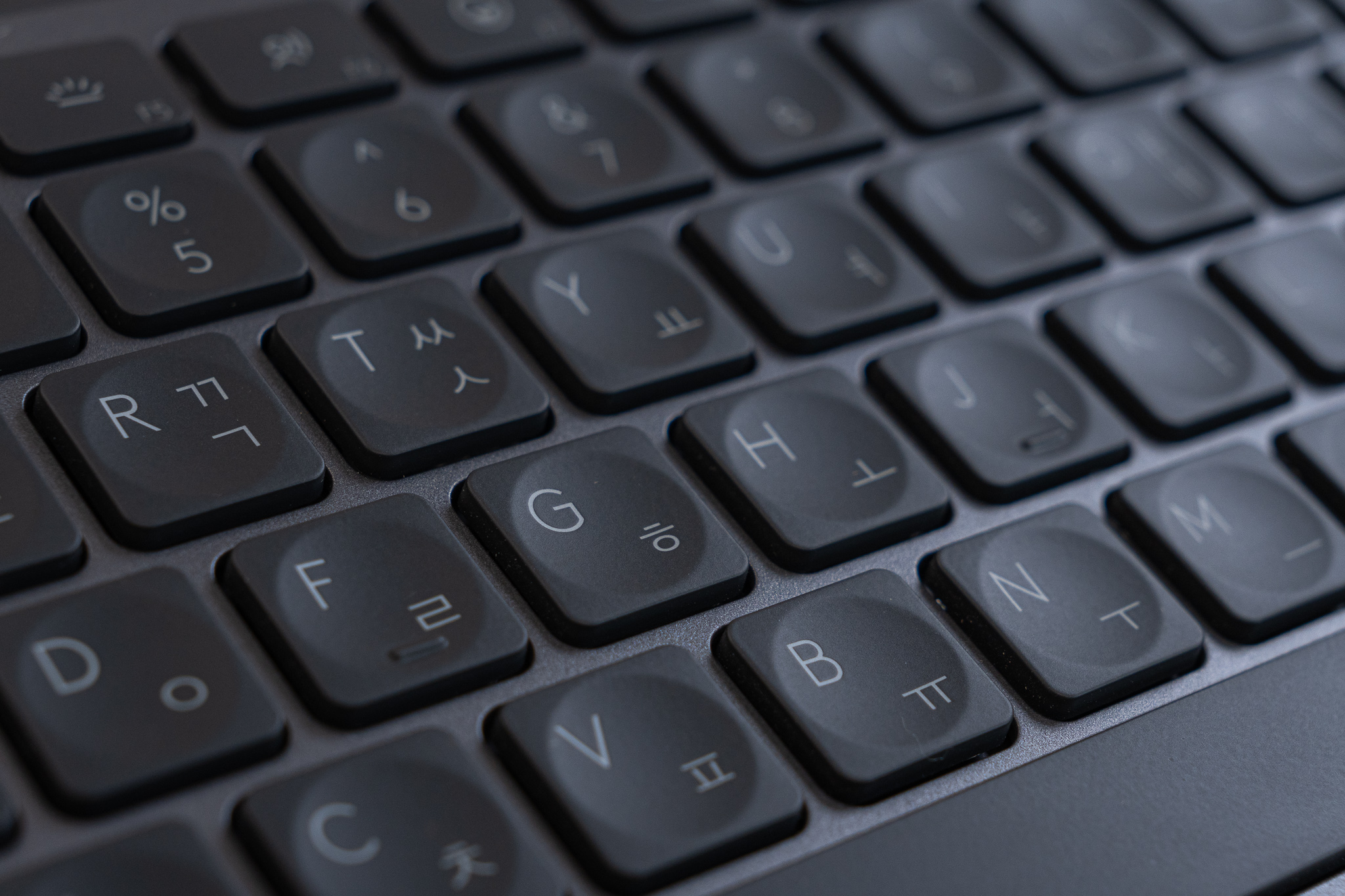 일단 키캡 재질이 단단하고 스위치에 단단하게 체결되어 있어서 키 흔들림이 거의 없고, 키 트래블도 2mm라서 펜타그래프 키보드 치고는 상당히 깊게 눌리는 편입니다. (대부분 펜타그래프 키보드는 키 트래블이 1.2~1.8mm) 키가 눌릴 때의 구분감도 조금 과장을 보태면 어지간한 갈축 기계식 키보드 수준이고, 반발력도 제법 강해서 키를 누를 때 찰진(?) 느낌도 잘 살아있고요.