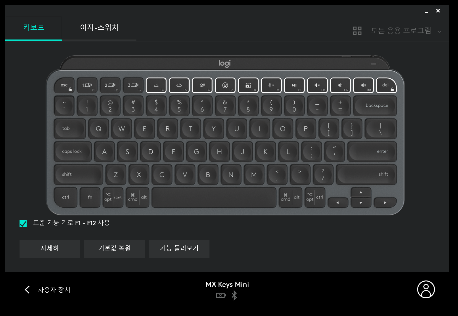 MX Keys 미니만 단독으로 사용한다면 Fn락 기능과 F4~Del 키의 기능을 변경하는 것 외에는 크게 설정할 수 있는 부분이 없을 거예요. 앞에도 잠시 언급했지만, Fn+방향키 조합으로 더 많은 단축키 지정이 가능했다면 더 좋았을 텐데 커스터마이징 방면에서는 조금 아쉽게 느껴졌습니다. 그래도 설치해두면 배터리가 방전되기 전에 알림도 보내주고 하는 소소한 편의 기능도 있으니 어지간하면 Logitech Options는 설치해서 사용하시는 것을 추천드려요.