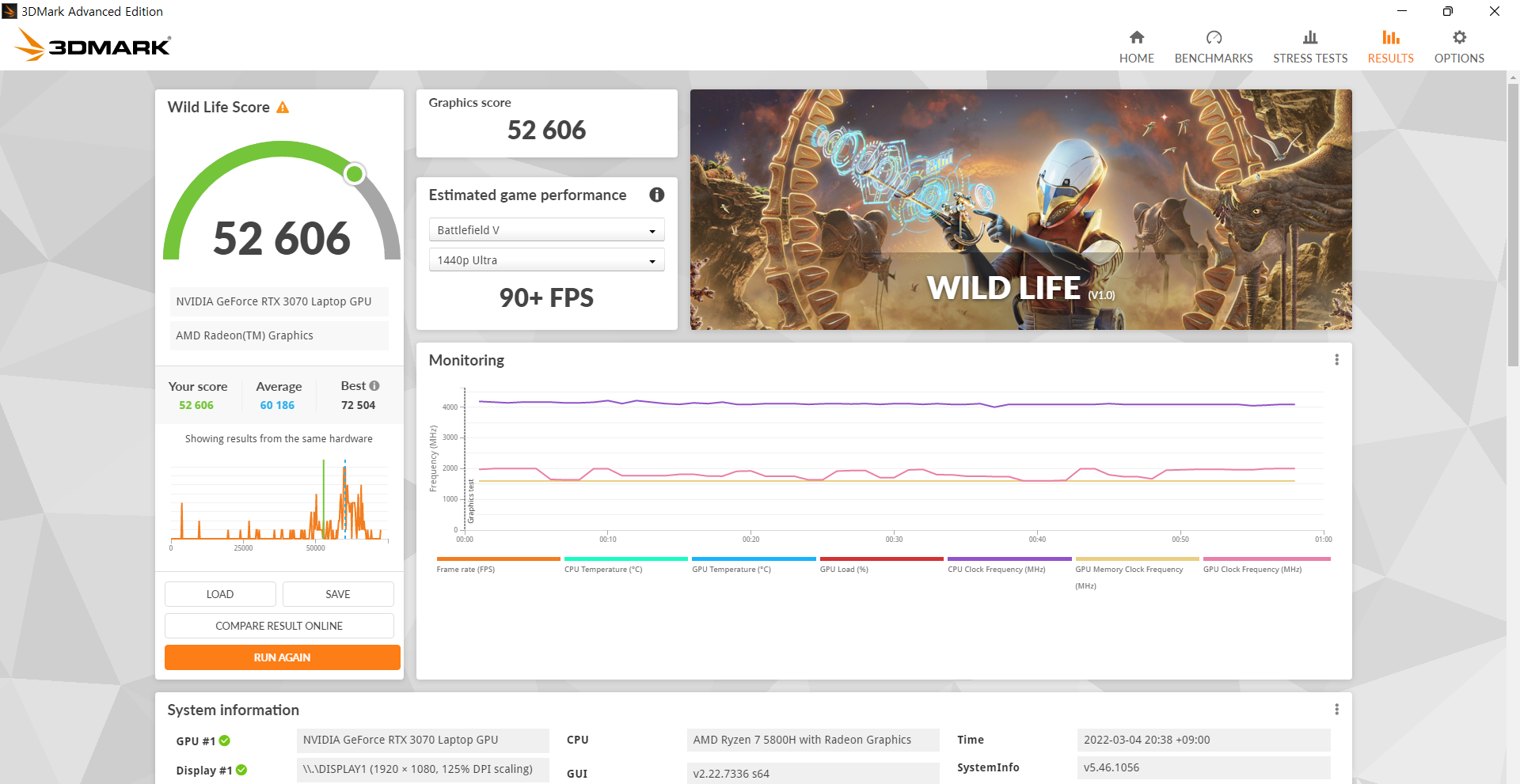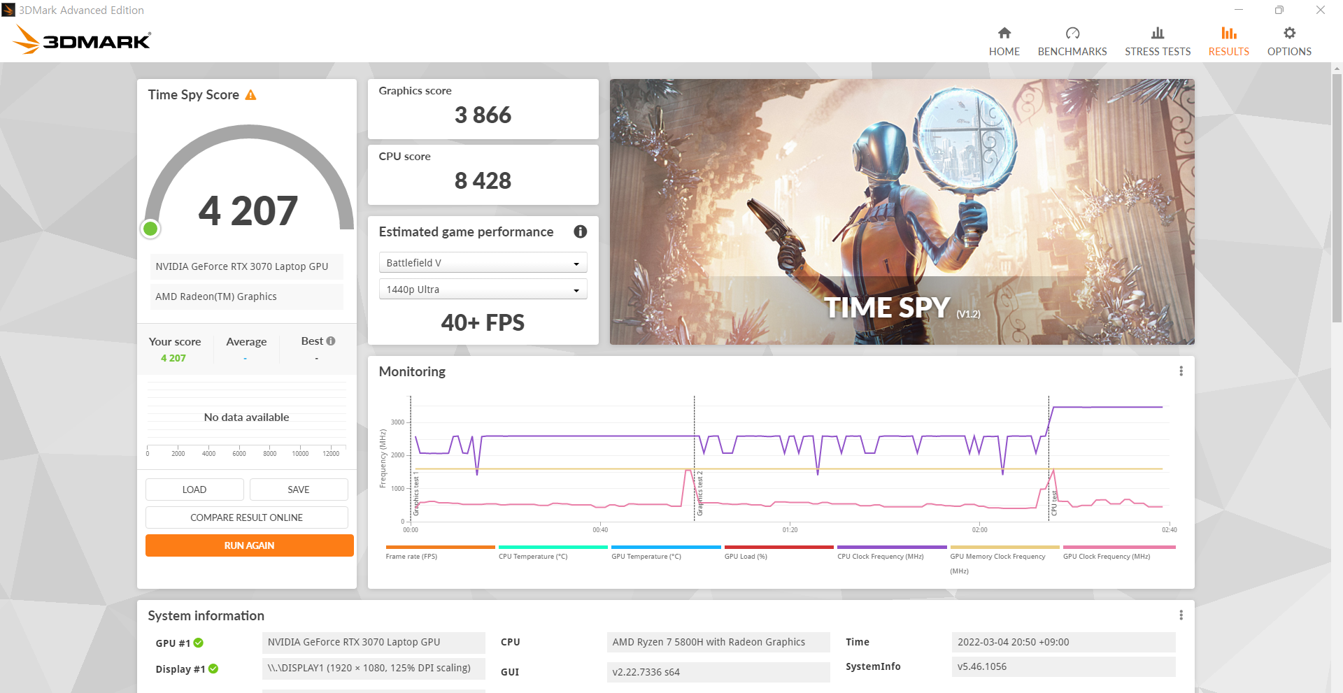 게임 성능도 기본적인 RTX3070급 게이밍 노트북 수준은 됩니다. 대부분의 중저사양 게임은 옵션 타협 없이 100프레임 이상 유지가 가능하고, 최신 고사양 게임들도 60프레임 이상은 충분히 방어할 수 있었습니다.