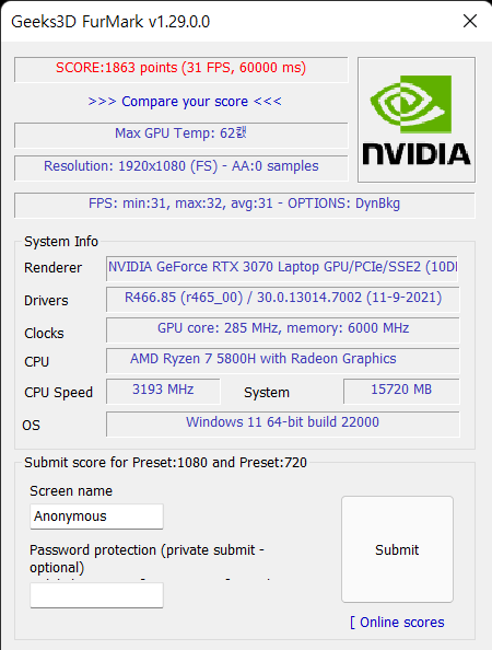 다만 옵티머스 상태에서 게임이나 벤치마크를 구동할 때 가끔 외장그래픽을 사용하지 않고 최대한 내장그래픽으로 구동하려는 경향이 있어서 프로그램마다 세부적으로 설정을 만져줘야 한다는 점이 조금 불편하더라고요.