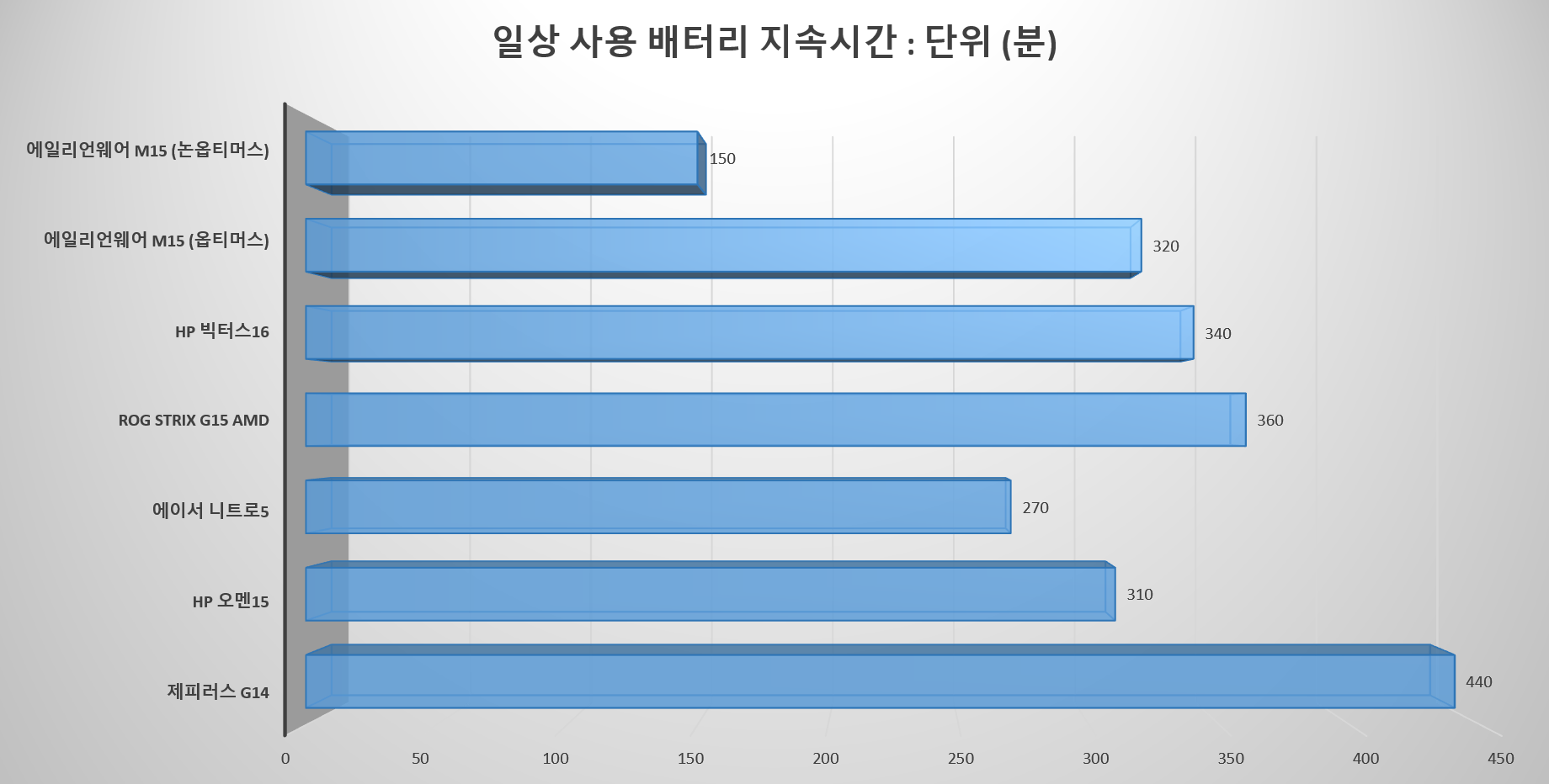 내장그래픽과 외장그래픽을 동시에 활용하는 옵티머스 모드 기준으로는 게이밍 노트북치고 배터리 지속력이 좋은 편이었습니다. 확실히 라이젠 CPU는 전성비가 좋아서 전력 효율이 중요한 상황에서 빛을 발하는 경향이 있는 것 같네요. 제가 블로그 편집 용도로 노트북을 사용했을 때 배터리 상태로 5시간 조금 넘게 사용할 수 있었습니다.