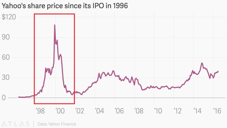 닷컴 버블의 피크였던 1998~2001년 사이의 야후 주가 차트를 보면 엄청난 롤러코스터였다는 것을 확인할 수 있네요. 2000년 중반 110달러 이상 하던 야후의 주가가 2년도 안 돼서 4달러까지 쪼그라들었다고 하니 무시무시하죠.