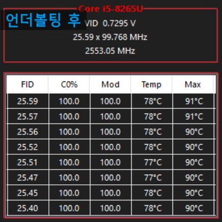 가끔 언더볼팅 전후 온도 차이가 없는 경우도 있는데, 그럴 경우 대부분 평균 코어 클럭이 올라가 있는 것을 확인할 수 있습니다. 저의 경우는 평균 온도도 낮아지고 클럭도 상승했네요.