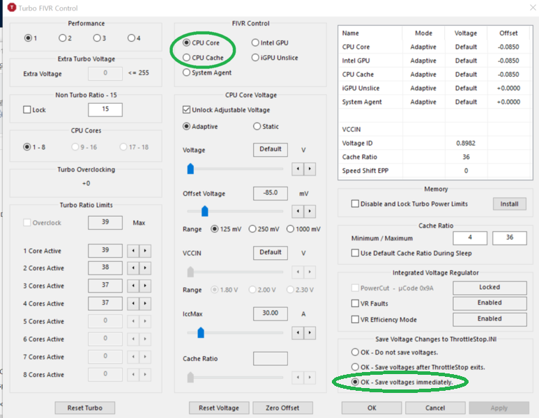 모든 작업이 완료되면 “Apply” > “OK” 버튼을 누르면 설정이 완료됩니다. 매번 Apply를 누르기 귀찮다면 “OK – Save voltages immediately”를 선택해두면 됩니다.