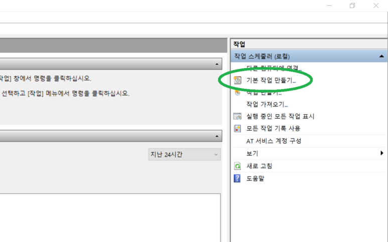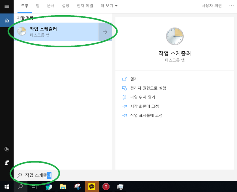자동 실행을 위해서는 윈도우 좌측 하단의 검색 버튼을 누른 후 “작업 스케줄러”라고 검색된 프로그램을 실행합니다. 혹시라도 영문 윈도우인 경우 “Task Scheduler”라고 검색하면 됩니다.