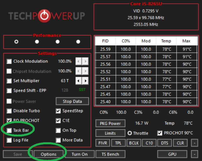 먼저 ThrottleStop 메인 메뉴에서 Task Bar 체크박스를 해제합니다. 그런 후 Options 버튼을 눌러서 Start Minimized와 Minimize on Close 체크박스를 체크해줍니다.