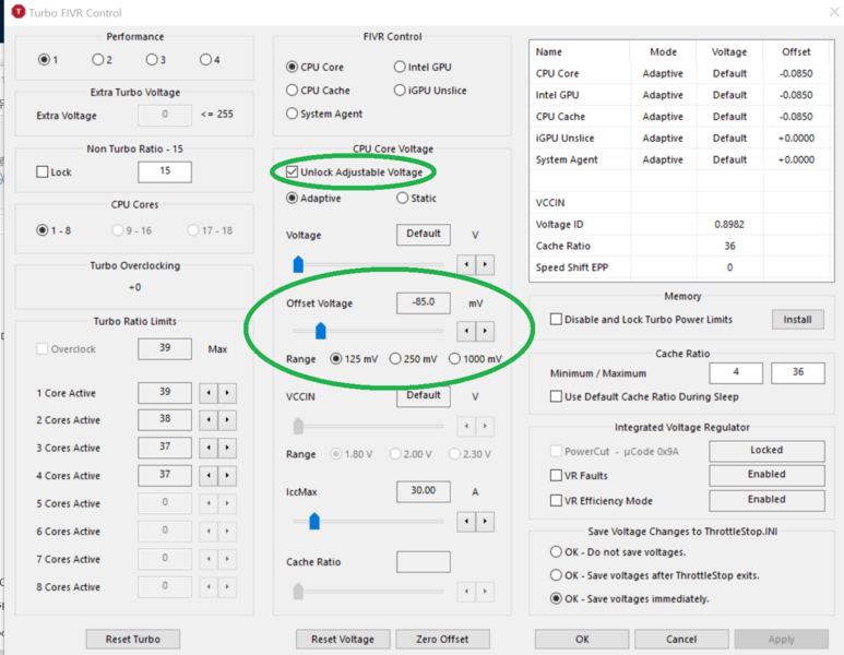 전 개인적으로 울트라북은 -65mV 정도, 게이밍 노트북은 -100mV 정도를 기준으로 잡은 후 가능하면 더 내려보는 것을 권장 드리고 싶네요. 참고로 ThrottleStop은 배수 때문인지 숫자의 세부적인 소수점까지는 조절이 불가능하지만 신경 쓰지 않아도 됩니다.