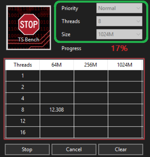 Priority = Normal / Threads = 본인 CPU 스레드 수 / Size = 1024M으로 설정한 후 Start 버튼 누릅니다.