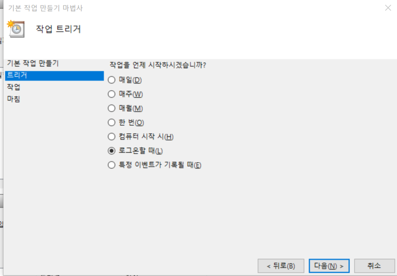 작업은 로그온 할 때마다 프로그램을 시작하도록 설정하고, 실행하고자 하는 프로그램의 경로를 지정해줍니다. 프로그램의 경로는 당연히 ThrottleStop.exe의 압축을 해제한 곳으로 지정해주면 됩니다.