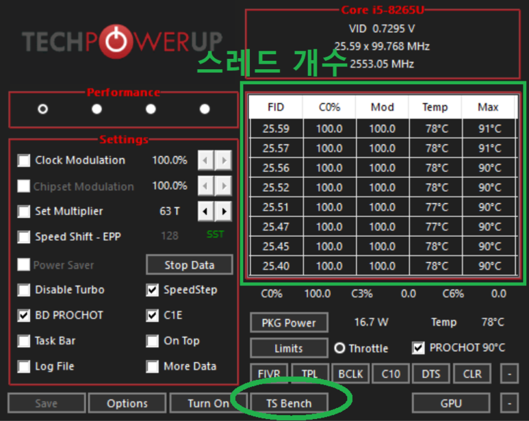 ThrottleStop의 메인 메뉴에서 “TS Bench” 버튼을 누르면 스트레스 테스트 설정을 할 수 있습니다. 여기서 본인의 노트북 CPU의 스레드가 몇 개인지를 알아야 하는데, 메인 메뉴의 FID에 몇 개의 스레드가 표시되는지를 확인하면 됩니다.