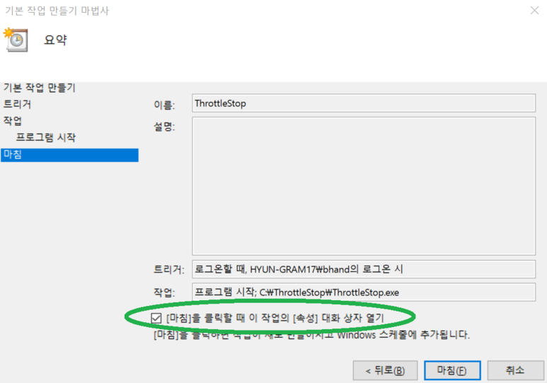 마지막 창에서 “[마침]을 클릭할 때 이 작업의 [속성] 대화 상자 열기”를 체크해준 후 마침 버튼을 눌러줍니다. 그러면 추가 속성 창이 뜨는데, 여기에서 “가장 높은 수준의 권한으로 실행”을 체크해준 후 마무리해주면 됩니다.