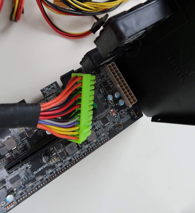 메인보드 파워를 조립할 때 주의해야 될 점은 파워 연결 부위의 메인보드가 지지대에서 떠있기 때문에 지나치게 힘을 주면 메인보드에 손상이 갈 수 있다는 것입니다. 메인보드의 하단부를 손가락으로 지지해주면서 조심스럽게 꽂아주도록 합니다.