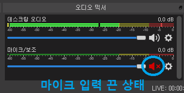 상당히 직관적인 메뉴입니다. 상단에 있는 “데스크탑 오디오”는 녹화되는 소리의 볼륨을 설정해주는 것이고, “마이크/보조”는 마이크 장치에 녹음된 소리의 볼륨을 설정해주는 것이죠. 당연히 마이크가 없을 경우 “마이크/보조” 탭은 신경쓰지 않아도 되지만, 요즘은 대부분의 노트북에 마이크가 내장되어 있기 때문에 본인의 목소리가 녹화 화면에 유입되길 원하지 않는다면 비활성화 시키는 것을 권장드립니다.