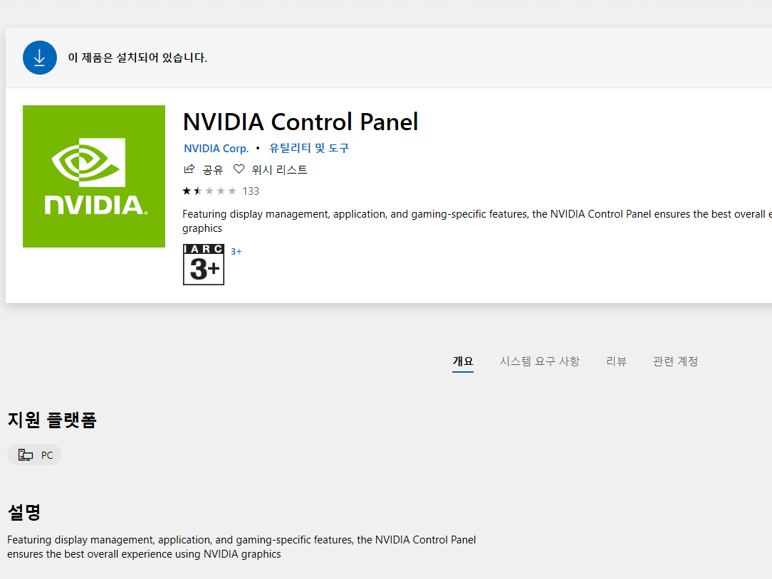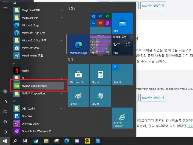 이럴 때에는 강제로 OBS가 내장그래픽의 출력만 인식하도록 설정해주면 됩니다. 윈도우 시작 메뉴에 “NVIDIA Control Panel”이라는 프로그램을 실행시키면 되는데, 만약 설치되어 있지 않다면 마이크로소프트 앱스토어에서 다운로드 받으시기 바랍니다.