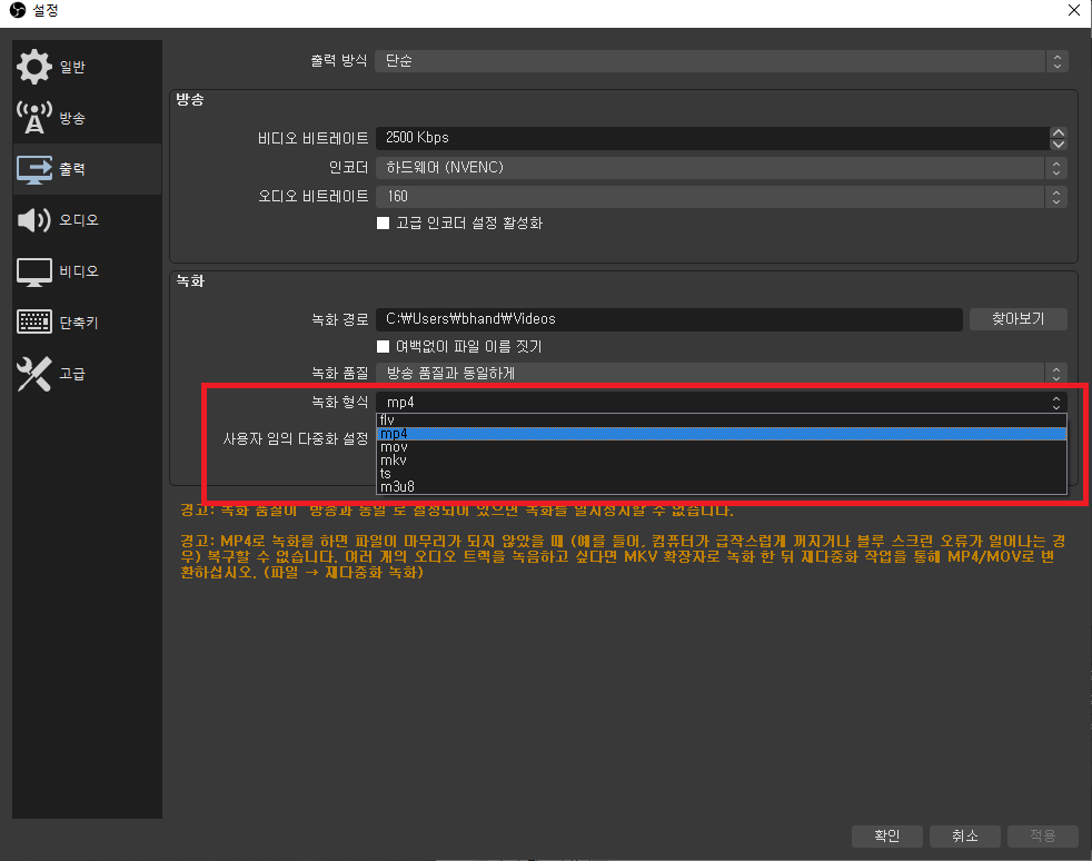“출력” 탭에서는 녹화된 파일의 저장 위치와 포맷을 선택할 수 있습니다. 녹화 형식 메뉴에는 다양한 포맷 선택이 가능하지만, 개인적으로 mkv 확장자를 사용하는 것이 좋습니다. 저도 친숙한 mp4 포맷을 사용하는 중이긴 하지만, 녹화 중 에러가 생길 경우 mkv 확장자의 경우 녹화한 데이터가 다 날아가지 않고 보존되기 때문에 비교적 안정적이기 때문이죠.