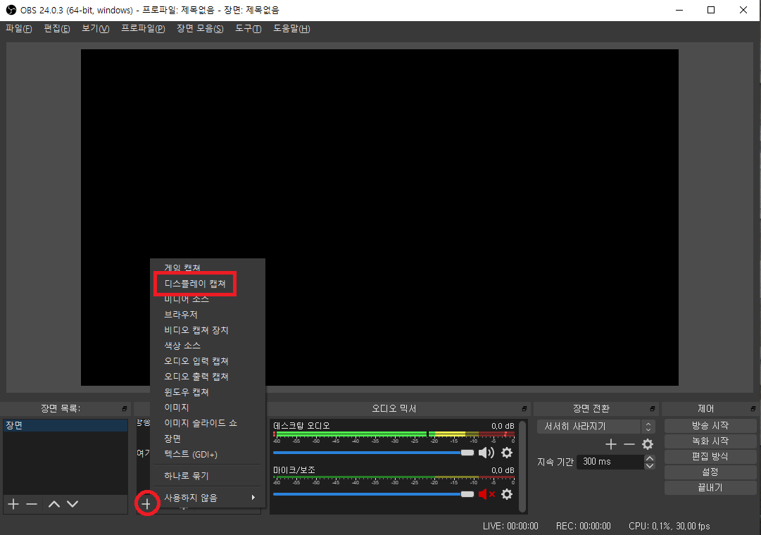 어떤 장면을 녹화할지 선택하는 메뉴입니다. (+) 버튼을 누르면 다양한 소스가 보일건데, 순수하게 화면만 녹화한다면 “디스플레이 캡처”를 선택하면 됩니다. 원할 경우 여기에 추가로 특정 이미지나 웹캠 녹화장면을 녹화 화면에 오버레이 할 수도 있으니 다양한 조합을 시도해보는 것을 추천드립니다.