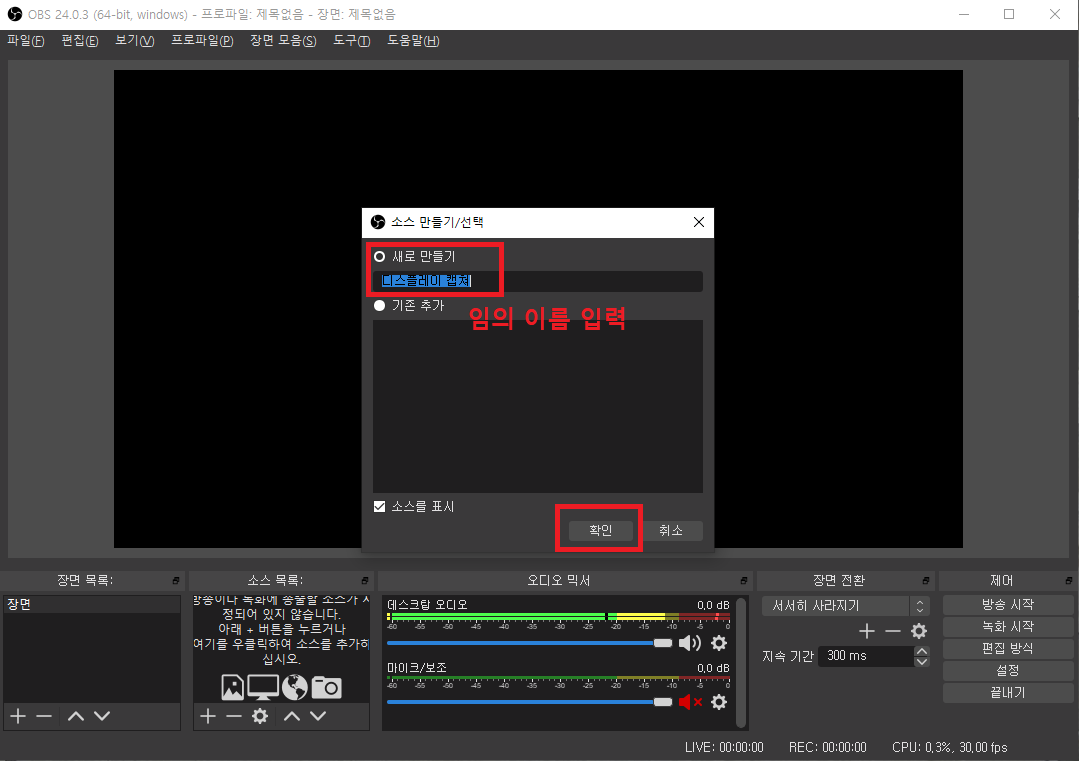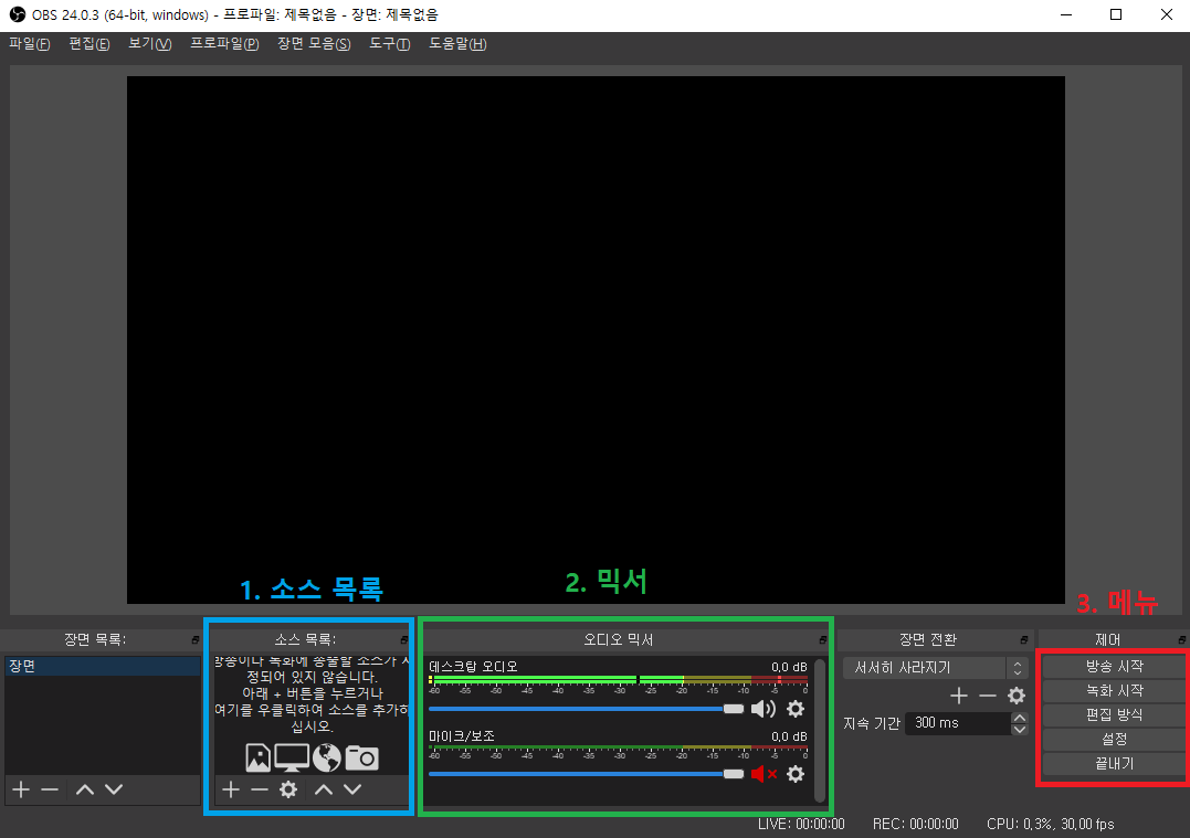 조작 순서대로 소스 목록 / 믹서 / 우측 메뉴로 구분해서 설명 드리도록 하겠습니다.