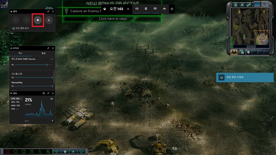 그 후 게임을 실행하는 중에 “윈도우 버튼+G” 단축키를 누르면 게임 바가 뜨게 되고, 녹화 버튼을 누르면 자동으로 게임 플레이가 녹화됩니다. 녹화 중지를 누르거나 게임을 끄면 자동으로 녹화본이 PC에 저장이 되는데, 이 파일은 [내PC\동영상] 폴더에 가면 찾아볼 수 있습니다.