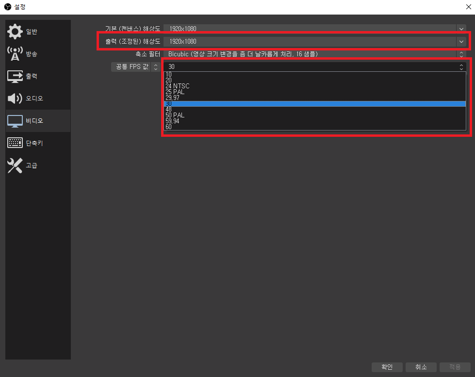 먼저 녹화하는 영상의 해상도와 FPS를 정해줘야겠죠? 우측 메뉴의 “설정 > 비디오” 탭으로 들어가면 해당 부분을 설정할 수 있습니다. 초기 세팅은 720p 해상도이기 때문에 선명한 영상을 캡처하려면 1080p로 바꿔주는 것을 권장드립니다.