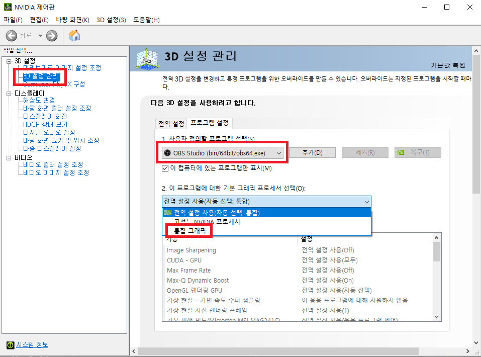 제어판이 열리면 “3D 설정 > 3D 설정 관리 > 프로그램 설정” 으로 진입해줍니다. 그 후 “사용자가 정의할 프로그램 선택” 탭에서 OBS Studio 프로그램을 찾아서 “이 프로그램에 대한 기본 그래픽 프로세서 선택 > 통합 그래픽”으로 변경해주면 됩니다. 그러면 옵티머스 여부와 관계없이 OBS는 이제 무조건 내장그래픽의 출력을 캡처하게 되는 것이죠.