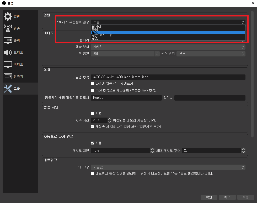 “고급” 탭에서는 설정할 수 있는 게 많지만 일반적으로 “프로세스 우선순위 설정” 정도만 만져줘도 충분하지 않을까 싶네요. 위에 언급한 대로 화면을 녹화하기 위해서는 CPU가 사용됩니다. 실행하는 프로그램과 녹화 프로그램을 동시에 구동하기에 CPU가 힘들어하는 순간이 오면 어떤 프로그램에 CPU 할당량을 배분해줄지 결정해주는 설정이죠.