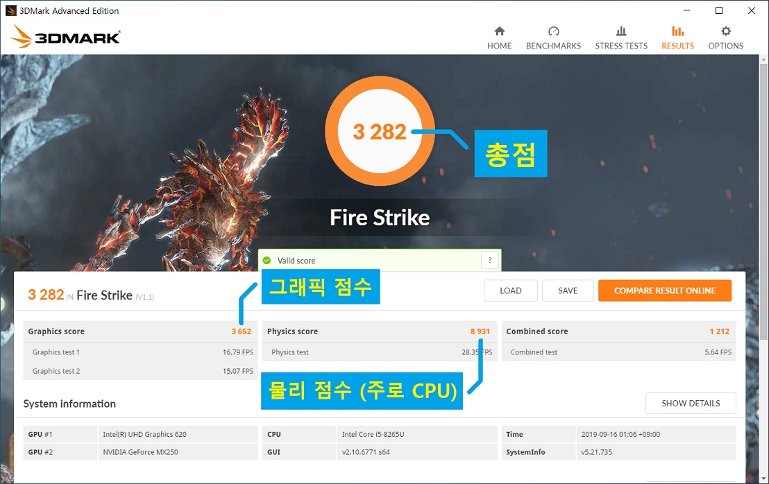 모든 테스트를 설명하자면 TMI니까 간단히 FireStrike 점수에 대해서만 짚고 넘어가겠습니다.
