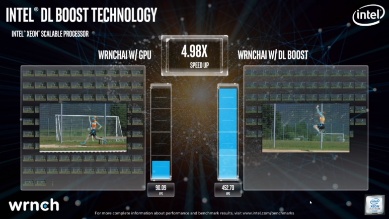 하지만 인텔은 신형 제온 프로세서에 도입된 DL Boost라는 AI 기능을 이용하면 CPU만으로도 기존 GPU가 수행해야 했던 작업을 더 빠르게 해낼 수 있다고 합니다. 물론 이 데모에 사용된 GPU가 정확히 어떤 모델인지에 대한 명시가 없었기 때문에 단순히 “5배 빠르다”라는 말을 그대로 믿기에는 무리가 있긴 하겠죠.